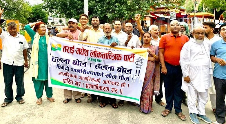 नागरिकता विधेयक प्रमाणीकरणको माग गर्दै राष्ट्रपति विद्यादेवी भण्डारीविरुद्ध तराई मधेस लोकतान्त्रिक पार्टीले आइतबार जनकपुरमा विरोध प्रदर्शन गरेको छ ।