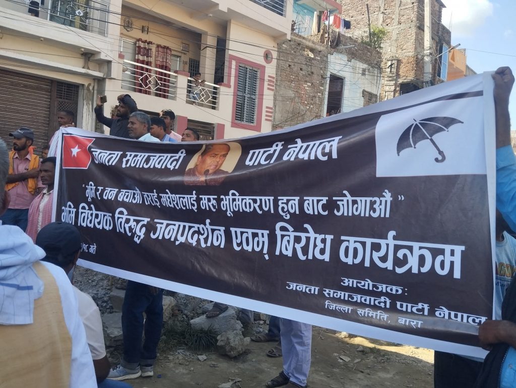 भदौ १८, रामबाबु मेहता। भूमि विधेयकविरुद्ध जनता समाजवादी पार्टी (जसपा) नेपालले बुधबार बाराको सदरमुकाम कलैयामा विरोध प्रदर्शन गरेको छ।