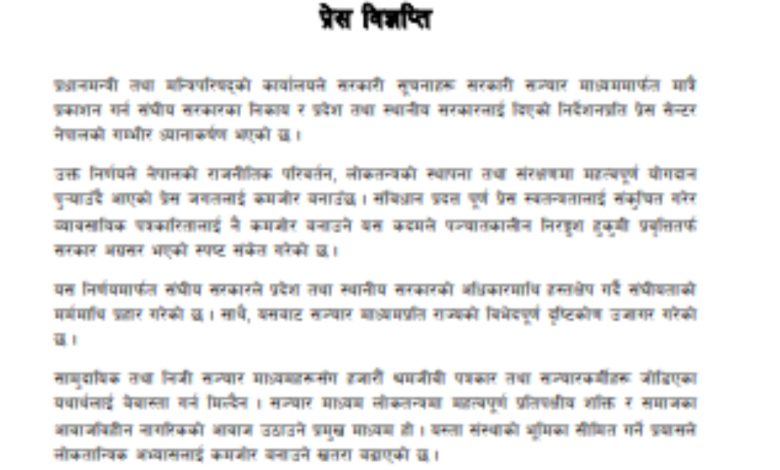 प्रेस सेन्टर नेपालले आज एक विज्ञप्ति जारी गर्दै उक्त निर्णयले प्रेस स्वतन्त्रता संकुचित गर्ने र व्यावसायिक पत्रकारितालाई कमजोर बनाउने आरोप लगाएको छ। यसले संघीयताको मर्ममाथि समेत प्रहार गरेको दाबी संगठनको छ।