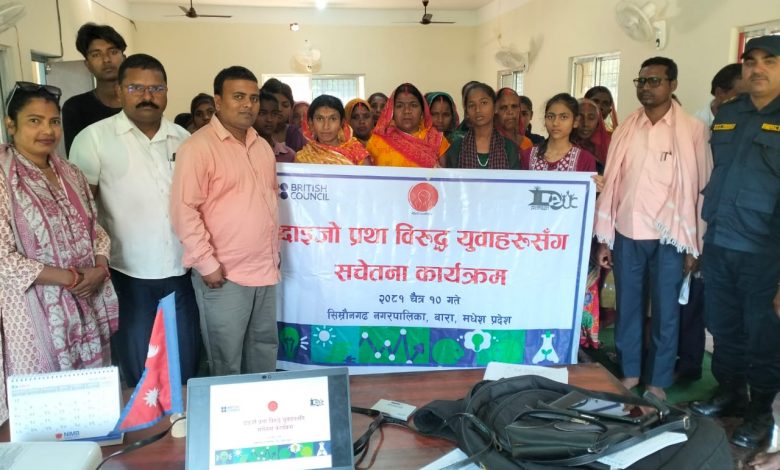 उमाकान्त कुशवाहा चैत १० । तराई मधेसमा बढ्दै गएको दाइजो पर्थालाइ हटाउन बाराको सिम्रौनगढमा आज यूवाहरु सङ्ग सचेतना कार्यक्रम सम्पन्न भएको छ । दलित उत्थान केन्द्र बाराको आयोजनामा सिम्रौनगढ नगरपालिकाको वाडा नम्बर २ को कार्यालयमा सम्पन्न भएको हो । ५० जना यूवा युवती सहभागी रहेको सो दाइजो विरुद्धको सचेतना कार्यक्रममा प्रशिक्षक कुन्दन रामले दाइजोको कारण समाजमा भइ रहेको अपराधीक घटना घरेलु महिला हिंसा , आत्म हत्या समेतको घटनाहरु बढदै गएको बताए ।