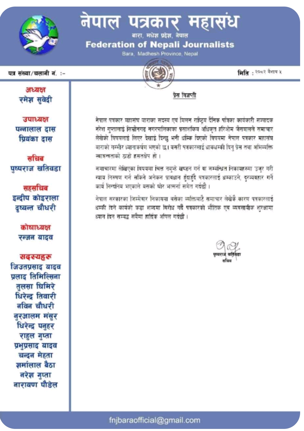 सिम्रौनगढ न.पा का प्रमुख प्रशासकीय अधिकृत जैसवालले दिइएको अभिव्यक्ति प्रति महासंघ बाराको घोर भत्सर्ना