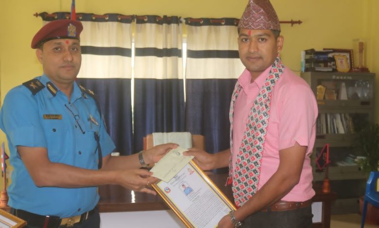 खतिवडालाई जिल्ला प्रहरी कार्यालय बाराका प्रमुख तथा प्रहरी उपरीक्षक सन्तोष तामाङ्गले उत्कृष्ट प्रहरी भन्दै सम्मान सहित प्रमाणपत्रमा हस्ताक्षर गरि हस्तान्तरण गरेका छ्न।