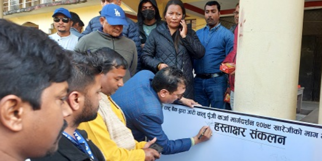 हस्ताक्षर संकलन कार्यक्रममा सहभागी व्यवसायीहरुलाई कोरोना महामारी, आर्थिक मन्दी, त्यसमाथि कर्जामा गरिएको ब्याज वृद्धिले समस्या बनाएको बताउनुभयो । यही अवस्था रहिरह्यो भने आफूहरु व्यवसाय छाडेर अन्यत्र पलायन हुनपर्ने दिन आउनसक्ने उहाँले बताउनुभयो ।