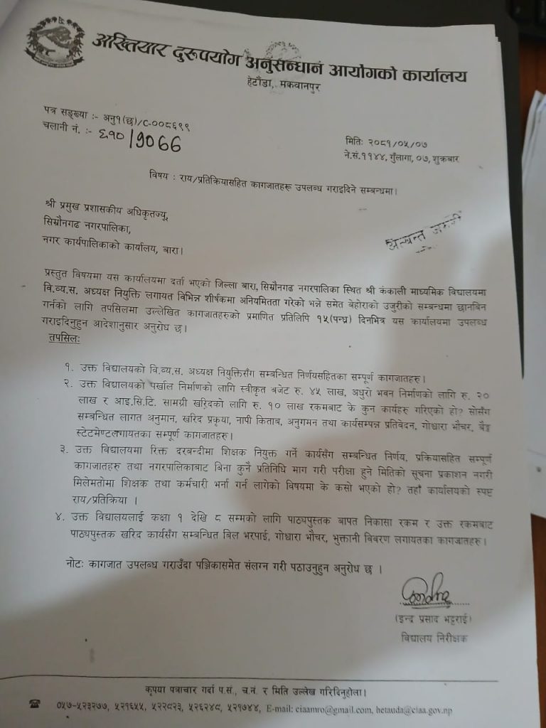 इन्जिनियर र बि .ब्यवस्थापक समितिको मिलोमतोमा कमेशन को चलखेल गरि निर्माण भएको सो भवन र पर्खाल निर्माणको छानबिनका लागि अख्तियार अनुशासन कार्यालय हेटौंडाको ध्यानाकर्षण भएको छ । अख्तियार को कार्यालयले सो कार्यको छानबिन गरि प्रतिवेदन पठाउन सिम्रौनगढ नगरपालिकालाइ १५ दिने पत्र समेत पठाएको छ । यता बिधालय ब्यवस्थाक समितिले आफुहरुले राम्रो काम गरेको तथा कुनै किसिमको कमेशनको काम नगरेको जिकिर गर्दै आएका छ्न ।