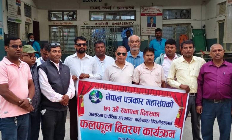 बारा। नेपाल पत्रकार महासंघको ७१ औं स्थापना दिवसका अवसरमा महासंघको बारा शाखाले सामाजिक उत्तरदायित्व निर्वाह गर्दै प्रादेशिक अस्पताल कलैयामा उपचाररत बिरामीहरूलाई फलफूल तथा पौष्टिक सामग्री वितरण गरेको छ।
