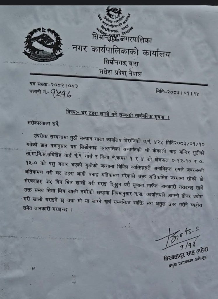 सिम्रौनगढ, बारा — नगरपालिकाले गुठीको जग्गामा अनाधिकृत रूपमा बनाइएका घर–टहरा हटाउन ३५ दिनको समयसीमा दिएको छ। नगर कार्यपालिकाको कार्यालयले सार्वजनिक सूचना जारी गर्दै तोकिएको अवधिभित्र संरचना खाली नगरे डोजर प्रयोग गरी हटाइने र खर्चसमेत सम्बन्धित व्यक्तिबाट असुल गरिने जनाएको हो।